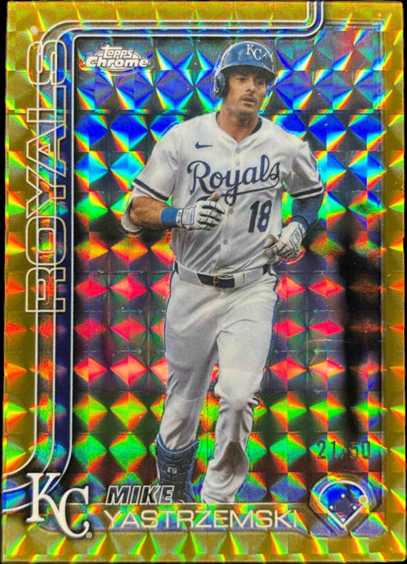 The Mike Yastrzemski 2025 Topps Chrome Update #USC44 Gold Geometric Refractor /50 card is 1 of 52 Mike Yastrzemski's card variations in the 2025 Topps Chrome Update set being tracked by Sports Card Investor, including Base, Geometric Refractor, Negative Refractor, Prism Refractor, and RayWave Refractor.