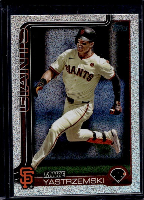 The Mike Yastrzemski 2025 Topps #186 Sandglitter card is 1 of 131 Mike Yastrzemski's card variations in the 2025 Topps set being tracked by Sports Card Investor, including Base, Aqua Holo Foil, Diamante Foil, Holo Foil, and Pink Diamante Foil.