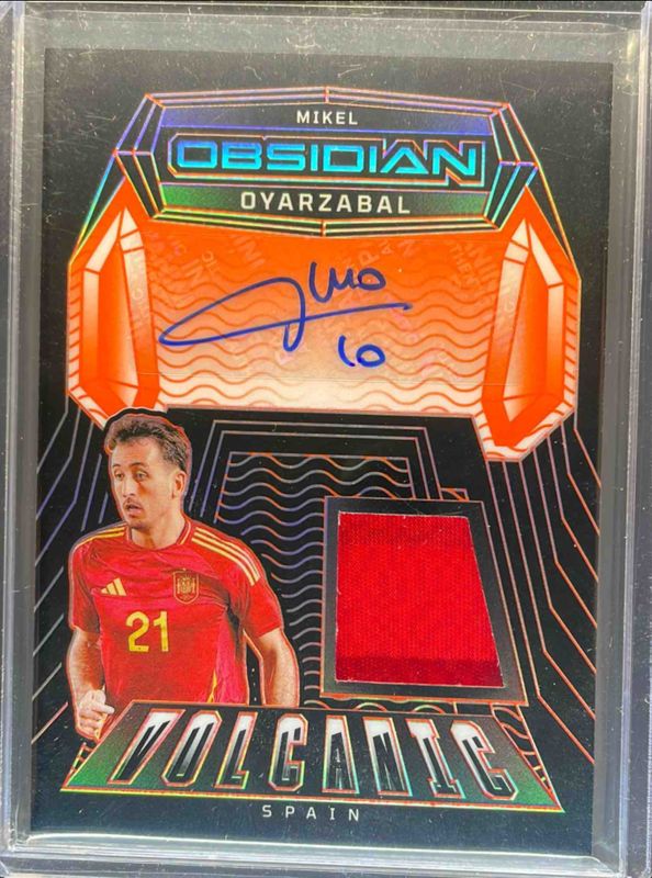 The Mikel Oyarzabal 2024 Obsidian #VS-MOY Volcanic Material Signatures - Electric Etch Orange /50 card is 1 of 26 Mikel Oyarzabal's card variations in the 2024 Obsidian set being tracked by Sports Card Investor, including Base /145, Electric Etch Red Pulsar /44, Electric Etch Orange /40, Electric Etch Purple Flood /30, and Electric Etch Imperial Jade /26.