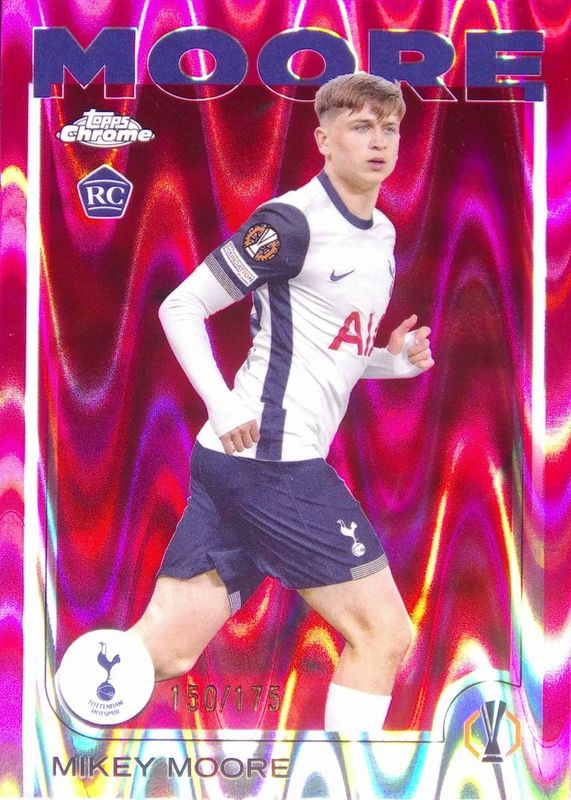 The Mikey Moore 2024 Topps Chrome UEFA Club Competitions #199 Neon Pink RayWave Refractor /175 Rookie card in Raw condition has not changed in price in the last 30 days and was last sold for $2.00 .