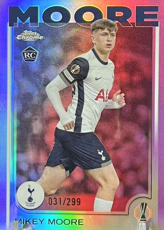 The Mikey Moore 2024 Topps Chrome UEFA Club Competitions #199 Violet Refractor /299 Rookie card in Raw condition has moved up $1.74 (+139%) in the last 30 days and was last sold for $2.99 .