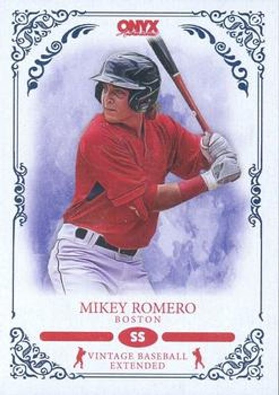 The Mikey Romero 2022 Onyx Vintage Extended #OVMR Base card is 1 of 6 Mikey Romero's card variations in the 2022 Onyx Vintage Extended set being tracked by Sports Card Investor, including Blue Signatures, Green Signatures, Red Signatures, Green /50, and Black Signatures /5.