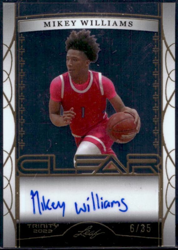 The Mikey Williams 2022 Leaf Trinity #CA-MW2 Clear Auto - Gold /35 card is 1 of 17 Mikey Williams' card variations in the 2022 Leaf Trinity set being tracked by Sports Card Investor, including Base /49, Gold /35, Blue /30, Holo Platinum /25, and Holo Green /20.
