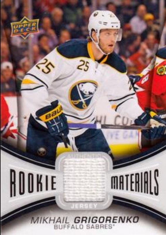 The Mikhail Grigorenko 2013 Upper Deck #RM-GR Rookie Materials card is 1 of 15 Mikhail Grigorenko's card variations in the 2013 Upper Deck set being tracked by Sports Card Investor, including Young Guns Base, Young Guns Canvas, Young Guns - Acetate, Young Guns - Jumbo, and Young Guns - UD Exclusives /100.