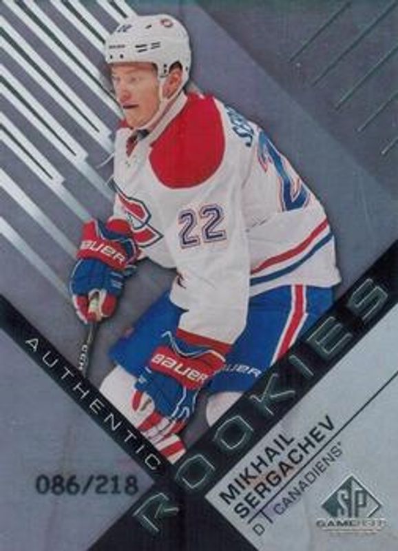 The Mikhail Sergachev 2016 SP Game Used #111 Rainbow Player Age /219 Rookie card is 1 of 12 Mikhail Sergachev's card variations in the 2016 SP Game Used set being tracked by Sports Card Investor, including Base /34, Black Rainbow, Blue Autographs, Purple, and Red Autographs Material.