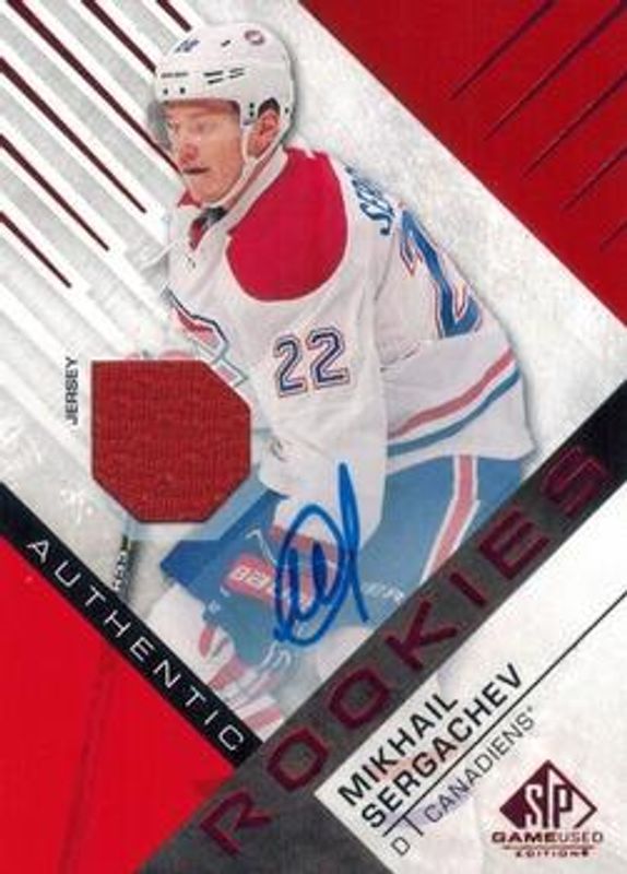 The Mikhail Sergachev 2016 SP Game Used #111 Red Autographs Material Rookie card is 1 of 12 Mikhail Sergachev's card variations in the 2016 SP Game Used set being tracked by Sports Card Investor, including Base /34, Black Rainbow, Blue Autographs, Purple, and Gold Material /399.