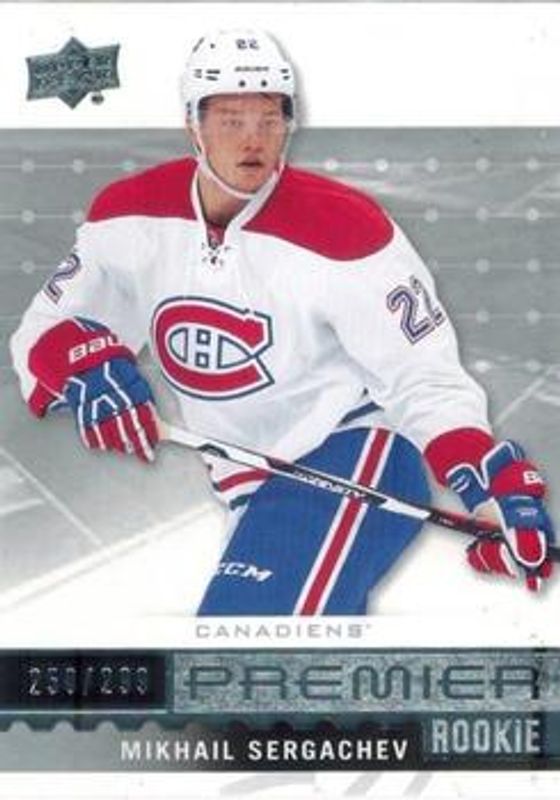 The Mikhail Sergachev 2016 Upper Deck Premier #R-1 Premier Rookies /299 card is 1 of 16 Mikhail Sergachev's card variations in the 2016 Upper Deck Premier set being tracked by Sports Card Investor, including Base /299, Silver Spectrum Autographs /10, Platinum Blue Spectrum Autographs /5, Rookies Jersey, and 2003 Tribute Rookie Autographs Patch /99.