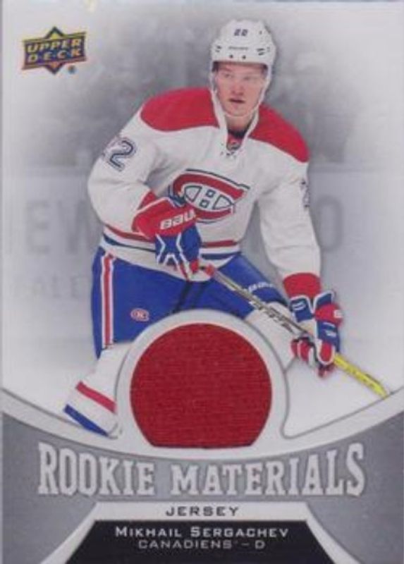 The Mikhail Sergachev 2016 Upper Deck #RM-MS Rookie Materials card is 1 of 29 Mikhail Sergachev's card variations in the 2016 Upper Deck set being tracked by Sports Card Investor, including Young Guns Base, Young Guns Canvas, Young Guns - Clear Cut, Young Guns - Gold Rainbow Foil, and Young Guns - Jumbo.