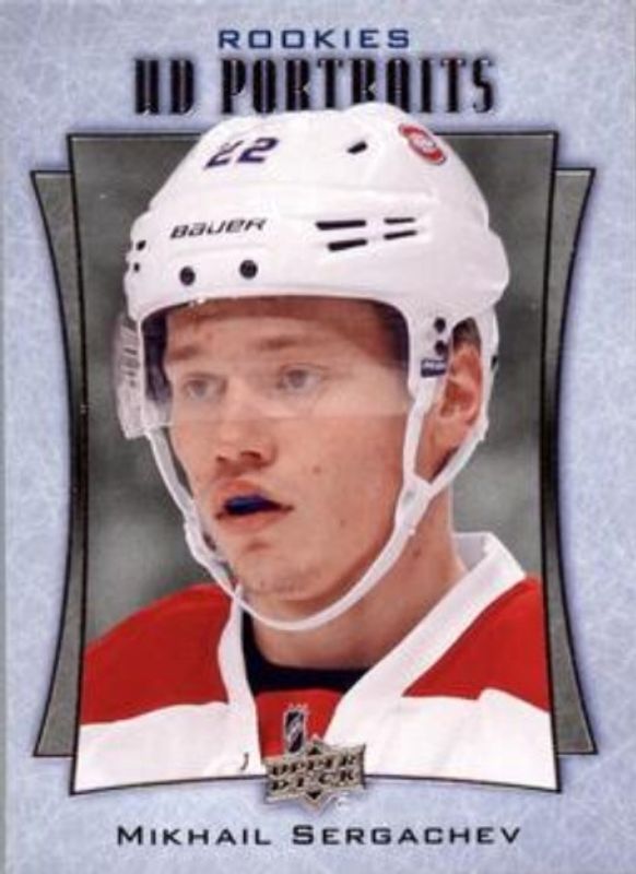 The Mikhail Sergachev 2016 Upper Deck #P-95 UD Portraits Rookie card is 1 of 29 Mikhail Sergachev's card variations in the 2016 Upper Deck set being tracked by Sports Card Investor, including Young Guns Base, Young Guns Canvas, Young Guns - Clear Cut, Young Guns - Gold Rainbow Foil, and Young Guns - Jumbo.