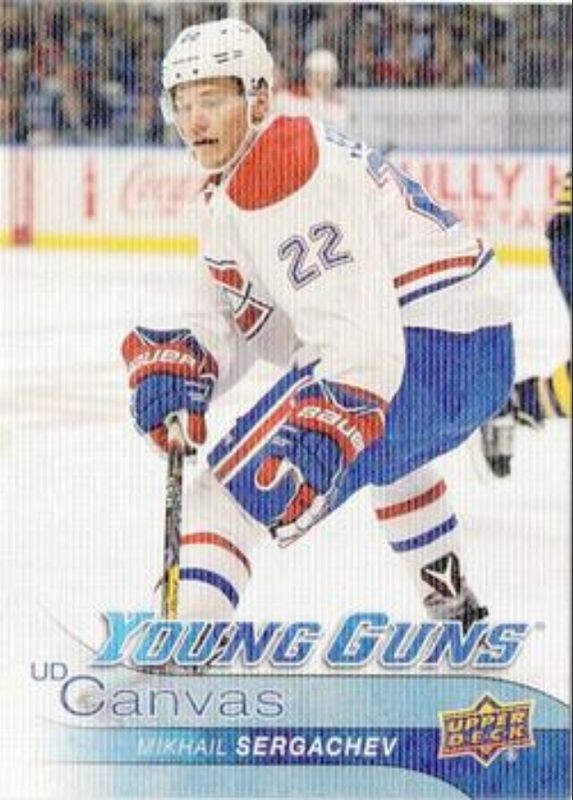 The Mikhail Sergachev 2016 Upper Deck #C100 Young Guns Canvas Rookie card is 1 of 29 Mikhail Sergachev's card variations in the 2016 Upper Deck set being tracked by Sports Card Investor, including Young Guns Base, Young Guns - Clear Cut, Young Guns - Gold Rainbow Foil, Young Guns - Jumbo, and Young Guns - Silver Foil.