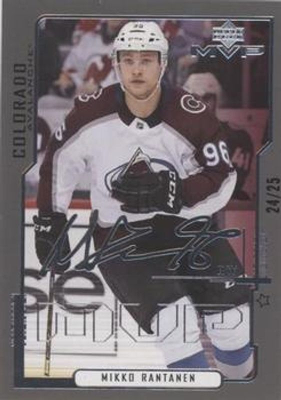 The Mikko Rantanen 2020 Upper Deck MVP #23 20th Anniversary First Star /25 card is 1 of 18 Mikko Rantanen's card variations in the 2020 Upper Deck MVP set being tracked by Sports Card Investor, including Base, Blue, Gold Script, Puzzle Backs, and Silver Script.