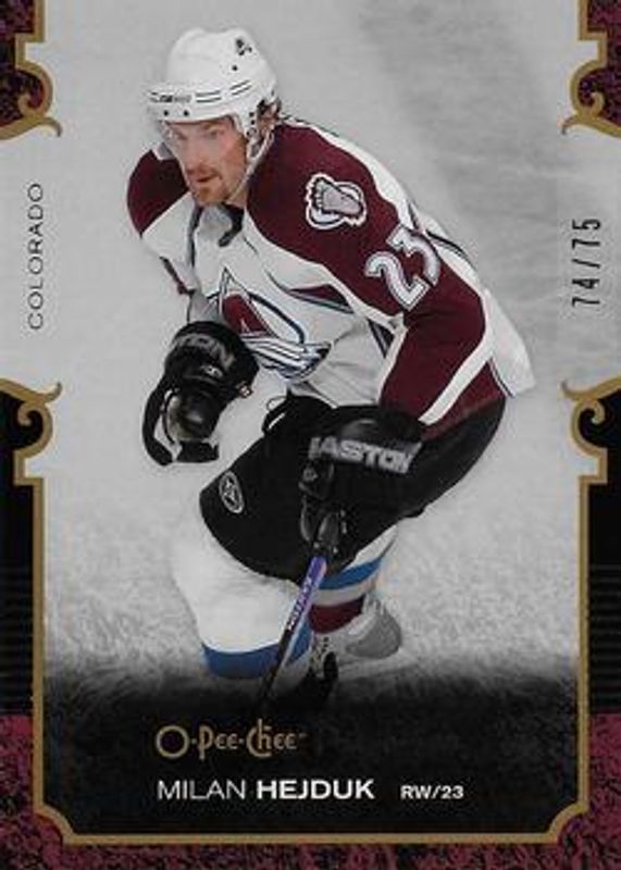 The Milan Hejduk 2007 O-Pee-Chee Premier #23 Gold /50 card is 1 of 14 Milan Hejduk's card variations in the 2007 O-Pee-Chee Premier set being tracked by Sports Card Investor, including Base /299, Silver Spectrum /35, Gold Spectrum /15, Black /1, and Penmanship /100.