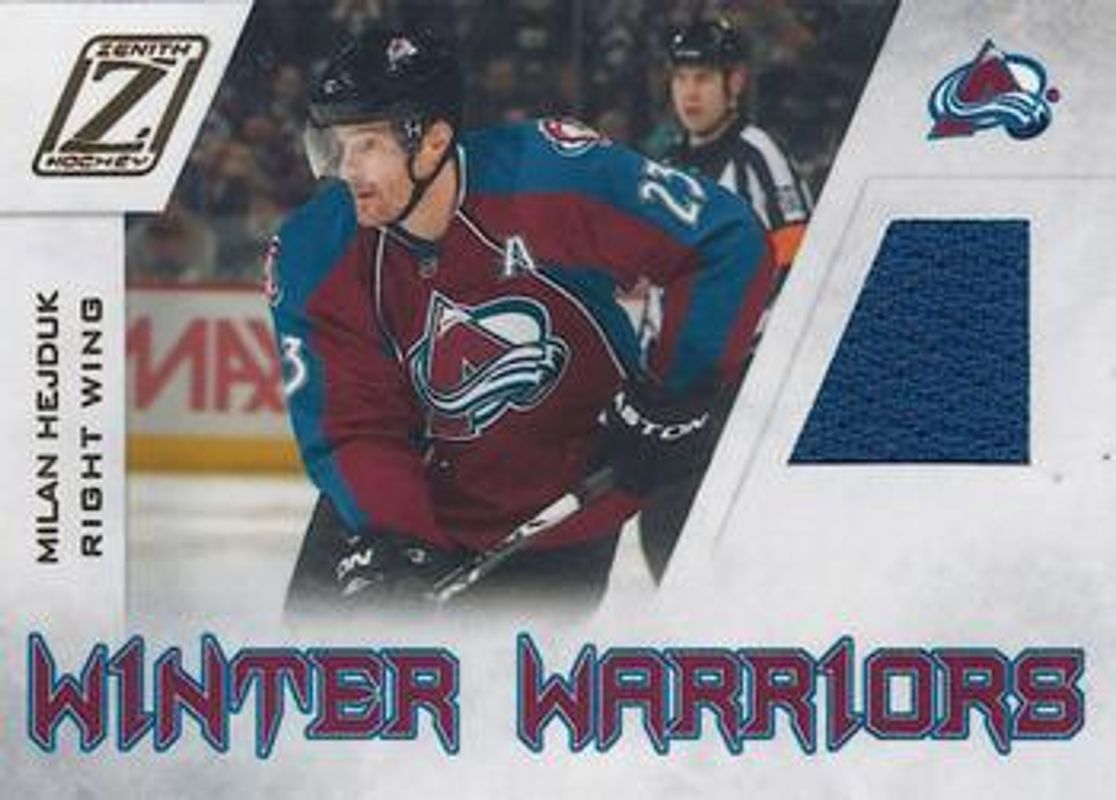 The Milan Hejduk 2010 Zenith #MH Winter Warriors Materials card is 1 of 8 Milan Hejduk's card variations in the 2010 Zenith set being tracked by Sports Card Investor, including Epix, Epix Materials /100, Winter Warriors Materials Prime /50, Epix - Printing Plates Black /1, and Epix Printing Plates Cyan /1.