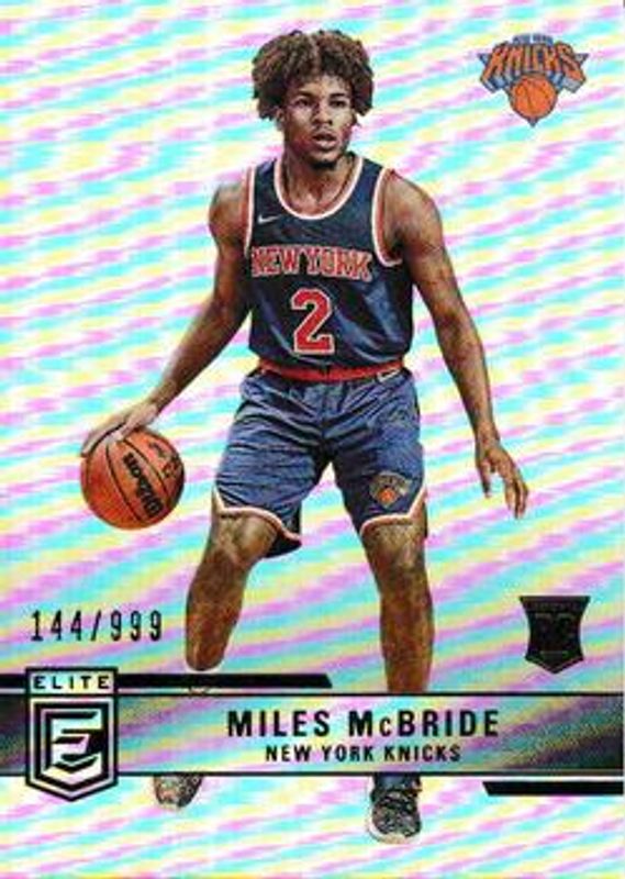 The Miles McBride 2021 Elite #219 Base Rookie card is 1 of 25 Miles McBride's card variations in the 2021 Elite set being tracked by Sports Card Investor, including Asia Exclusive, Asia Hyper Gold, Asia Hyper Red, Aspirations, and Orange.