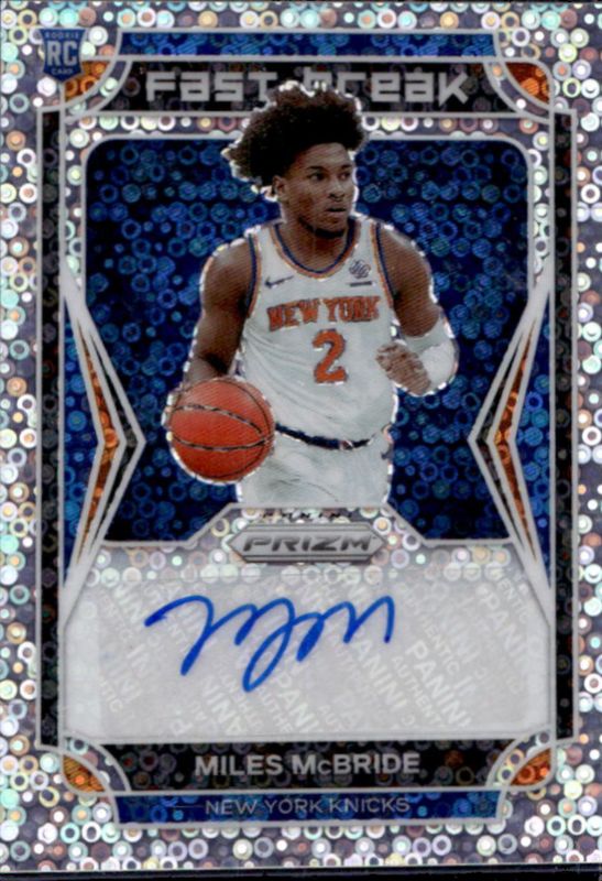 The Miles McBride 2021 Prizm #FBR-MMC Fast Break Rookie Autographs card is 1 of 84 Miles McBride's card variations in the 2021 Prizm set being tracked by Sports Card Investor, including Base, Blue NBA 75th Anniversary, Blue Wave, Choice Blue Yellow Green, and Factory Set Blue Hyper.