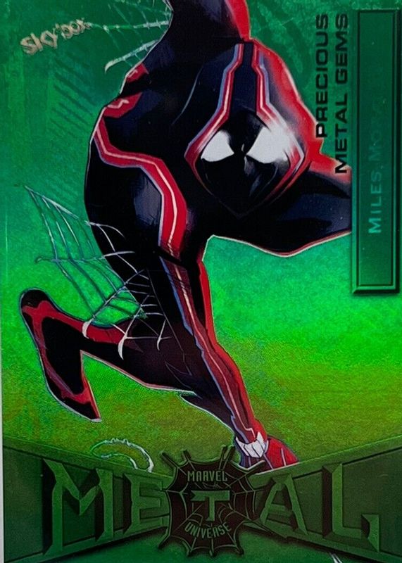The Miles Morales 2021 Skybox Marvel Metal Universe Spider-Man #52 Precious Metal Gems Green /10 card in Raw condition has not changed in price in the last 30 days and was last sold for $8,100.00 .