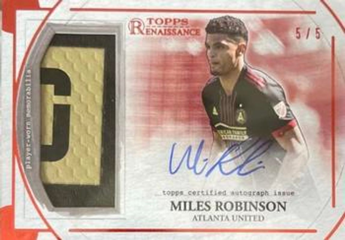 The Miles Robinson 2022 Topps Renaissance MLS Major League Soccer #AR-MR7 Autographed Relics - Ruby /5 card is 1 of 65 Miles Robinson's card variations in the 2022 Topps Renaissance MLS Major League Soccer set being tracked by Sports Card Investor, including #AR-MR1 Autographed Relics /20, #AR-MR7 Autographed Relics /20, #AR-MR6 Autographed Relics /20, #AR-MR5 Autographed Relics /20, and #AR-MR4 Autographed Relics /20.
