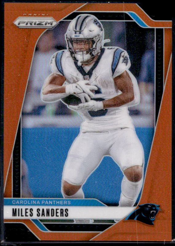 The Miles Sanders 2024 Prizm #38 Orange /249 card is 1 of 83 Miles Sanders' card variations in the 2024 Prizm set being tracked by Sports Card Investor, including Base, Choice Blue Yellow Green, Choice Silver, Disco, and Green.
