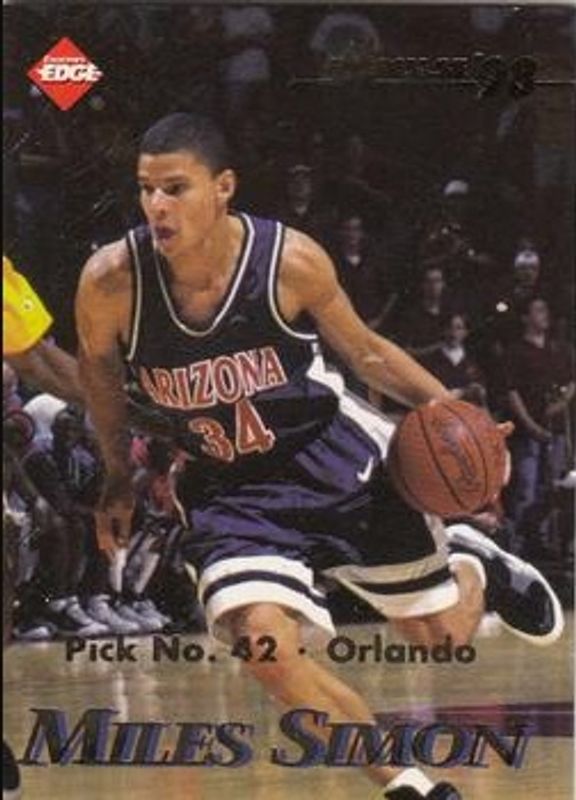 The Miles Simon 1998 Collector's Edge Impulse #21 Thick Rookie card is 1 of 7 Miles Simon's card variations in the 1998 Collector's Edge Impulse set being tracked by Sports Card Investor, including Base, Jersey City '99, Jersey City '99 Gold /5000, Jersey City '99 SN50 /50, and Pro Signatures.