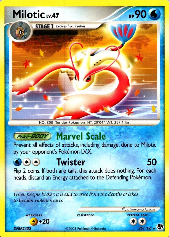 The Milotic 2008 Diamond & Pearl: Great Encounters #025/106 Base card in Raw TCG (Near Mint) condition has moved down -$0.99 (-33.1%) in the last 30 days and was last sold for $2.00 .