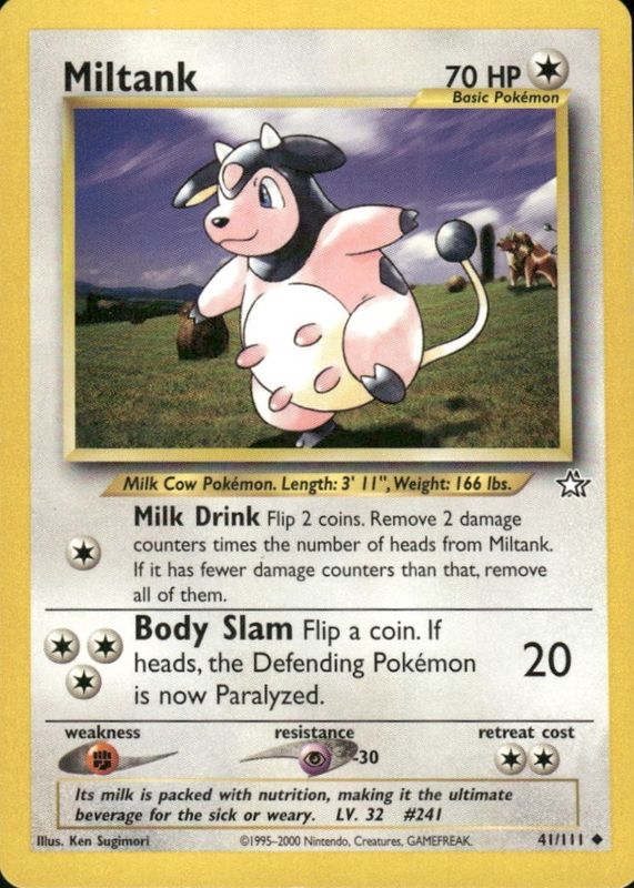 The Miltank 2000 Neo Genesis #41/111 Unlimited card in Raw TCG (Near Mint) condition has moved down -$1.27 (-25.4%) in the last 30 days and was last sold for $3.73 .