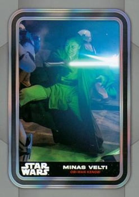 The Minas Velti 2023 Topps Star Wars #48 Base card is 1 of 17 Minas Velti's card variations in the 2023 Topps Star Wars set being tracked by Sports Card Investor, including Gold Foilboard, Rainbow Foil, Green Foilboard /499, Orange Foilboard /299, and Red Foilboard /199.