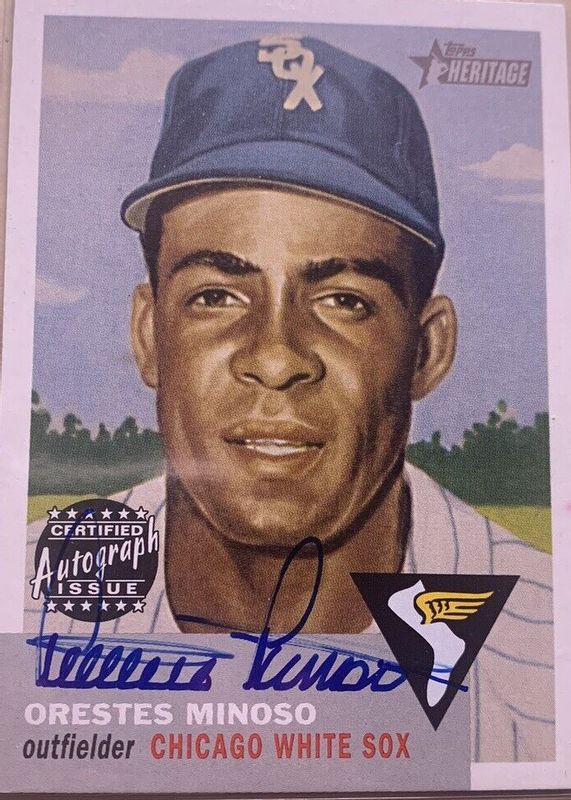 This card is 1 of 2 Minnie Minoso's card variations in the 2002 Topps Heritage set being tracked by Sports Card Investor, including Real One Autographs - Red Ink /53.