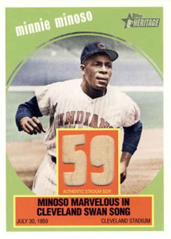 The Minnie Minoso 2008 Topps Heritage #FR-MIM Flashbacks Seat Relics /59 card is 1 of 9 Minnie Minoso's card variations in the 2008 Topps Heritage set being tracked by Sports Card Investor, including Baseball Flashbacks, Clubhouse Collection Relics, Real One Autographs, Real One Autographs - Red Ink /59, and Clubhouse Collection Relics Autographs /25.