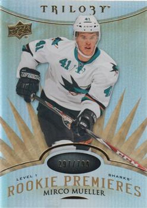 The Mirco Mueller 2014 Upper Deck Trilogy #129 Base /799 Rookie card is 1 of 12 Mirco Mueller's card variations in the 2014 Upper Deck Trilogy set being tracked by Sports Card Investor, including #195 Base /799, #162 Base /799, #129 Radiant Blue /499, #162 Radiant Blue /499, and #195 Radiant Blue /499.