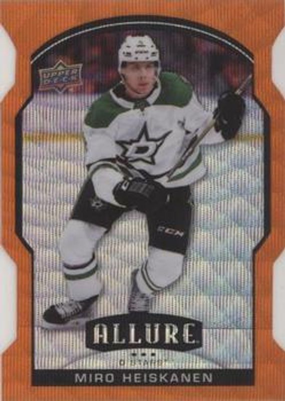 The Miro Heiskanen 2020 Upper Deck Allure #41 Orange Slice card is 1 of 38 Miro Heiskanen's card variations in the 2020 Upper Deck Allure set being tracked by Sports Card Investor, including Base, 2005 Shield, Black Rainbow, Blue China, and Leopard.