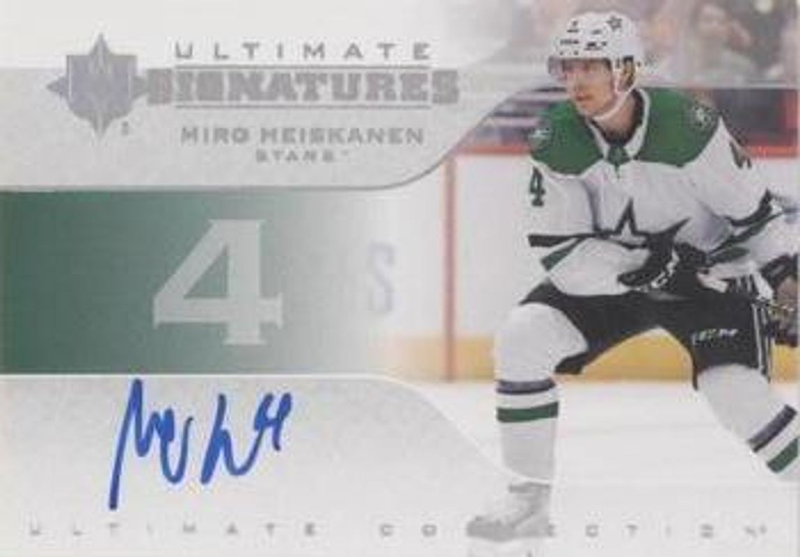 The Miro Heiskanen 2020 Upper Deck Ultimate Collection #US-MH 2019 Upper Deck Ultimate Collection Update: Ultimate Signatures card is 1 of 15 Miro Heiskanen's card variations in the 2020 Upper Deck Ultimate Collection set being tracked by Sports Card Investor, including Base /299, Autographs, Gold /35, Autographs Gold /15, and Jumbo Patch /15.