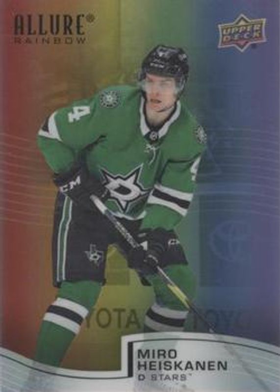 The Miro Heiskanen 2021 Upper Deck Allure #R-69 Rainbow - Double Rainbow card is 1 of 39 Miro Heiskanen's card variations in the 2021 Upper Deck Allure set being tracked by Sports Card Investor, including Base, Black Rainbow, Blue China, Orange Slice die-cut, and Pink Blue Leopard.