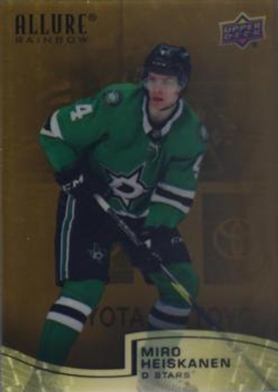 The Miro Heiskanen 2021 Upper Deck Allure #R-69 Rainbow - Golden Treasures /1 card is 1 of 39 Miro Heiskanen's card variations in the 2021 Upper Deck Allure set being tracked by Sports Card Investor, including Base, Black Rainbow, Blue China, Orange Slice die-cut, and Pink Blue Leopard.