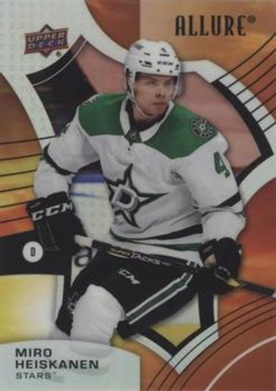 The Miro Heiskanen 2021 Upper Deck Allure #41 Sunrise card is 1 of 39 Miro Heiskanen's card variations in the 2021 Upper Deck Allure set being tracked by Sports Card Investor, including Base, Black Rainbow, Blue China, Orange Slice die-cut, and Pink Blue Leopard.
