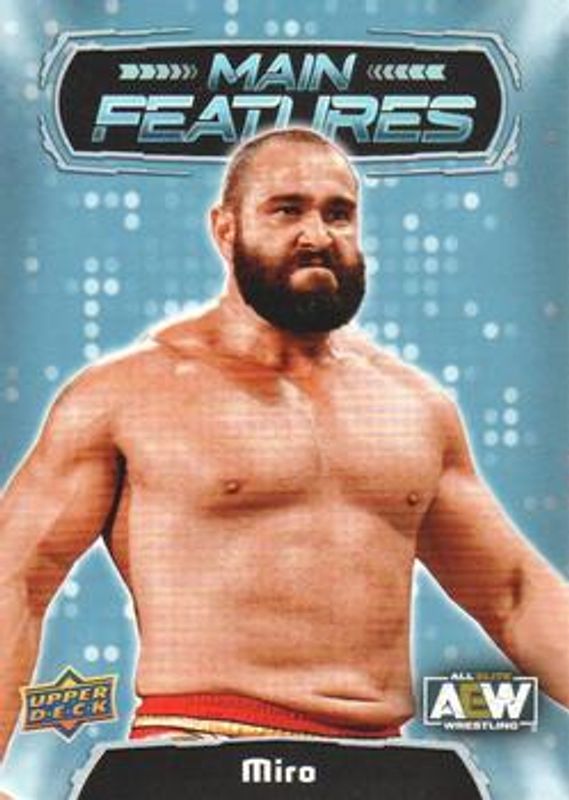 The Miro 2022 Upper Deck AEW #MF-34 Main Features card is 1 of 35 Miro's card variations in the 2022 Upper Deck AEW set being tracked by Sports Card Investor, including Base, Gold, Pyro, Silver Foil, and Green Pyro /399.