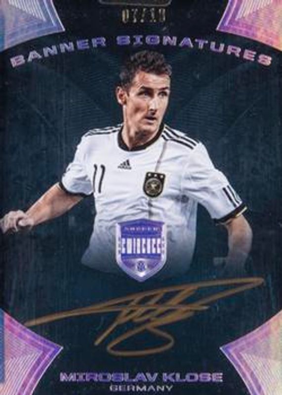 The Miroslav Klose 2018 Eminence #BS-MK Banner Signatures /10 card is 1 of 62 Miroslav Klose's card variations in the 2018 Eminence set being tracked by Sports Card Investor, including Autographs /10, Championship Calligraphy /10, Crown Jewels /10, Decade Dominance /10, and Gilded Graphs /10.