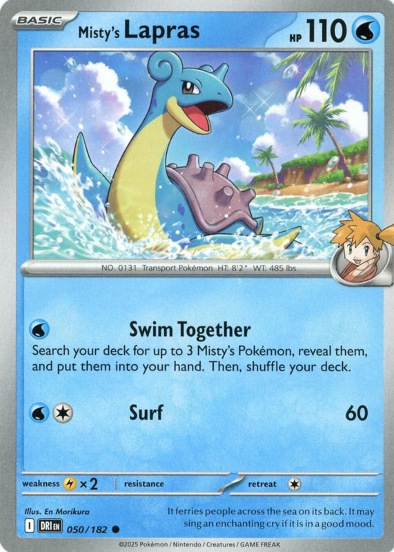 The Misty's Lapras 2025 Scarlet & Violet: Destined Rivals #050/182 Base card in Raw TCG (Near Mint) condition has moved down -$0.10 (-8.7%) in the last 30 days and was last sold for $1.10 .