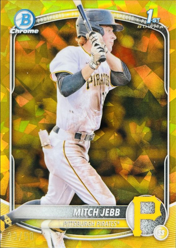 The Mitch Jebb 2025 Bowman Sapphire Edition #BCP-41 Chrome Prospects - Gold Refractor /50 card is 1 of 16 Mitch Jebb's card variations in the 2025 Bowman Sapphire Edition set being tracked by Sports Card Investor, including Chrome Prospects, Chrome Prospect Autographs /199, Chrome Prospect Autographs - Green Refractor /99, Chrome Prospects - Green Refractor /99, and Chrome Prospects - Yellow Refractor /75.