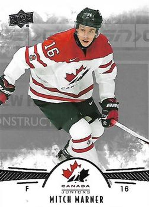 The Mitch Marner 2016 Upper Deck Team Canada Juniors #24 Base Rookie card is 1 of 39 Mitch Marner's card variations in the 2016 Upper Deck Team Canada Juniors set being tracked by Sports Card Investor, including #81 Base, #101 Base, #81 Exclusives /175, #24 Exclusives /175, and #24 High Gloss Spectrum /25.