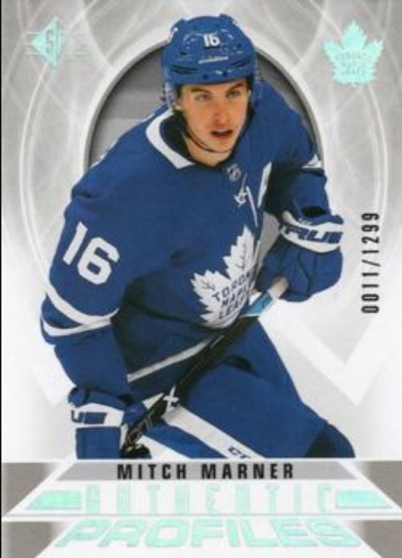 The Mitch Marner 2020 SP #AP-14 Authentic Profiles - Silver Spectrum /1299 card is 1 of 14 Mitch Marner's card variations in the 2020 SP set being tracked by Sports Card Investor, including Base /2299, Blue, Authentic Profiles - Blue, Authentic Profiles Jersey, and Authentic Profiles - Pyrotechnic Gold.