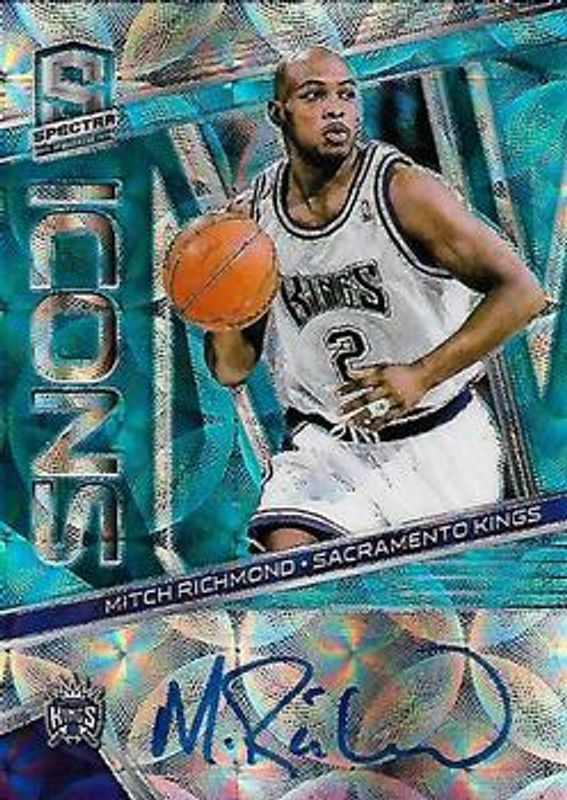 The Mitch Richmond 2018 Spectra #IA-MRM Icons Autographs - Neon Blue /60 card is 1 of 19 Mitch Richmond's card variations in the 2018 Spectra set being tracked by Sports Card Investor, including Icons Autographs /75, Award Winning Autographs - Neon Blue /60, Making it Rain Autographs - Neon Blue /60, Award Winning Autographs - Neon Green /49, and Icons Autographs - Neon Green /49.