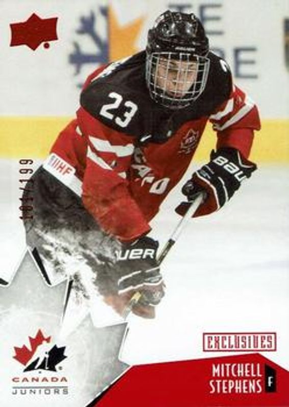 The Mitchell Stephens 2015 Upper Deck Team Canada Juniors #94 Exclusives /199 card is 1 of 32 Mitchell Stephens' card variations in the 2015 Upper Deck Team Canada Juniors set being tracked by Sports Card Investor, including #94 Base, #19 Base, #19 Gold, #94 Gold, and #19 Exclusives /199.