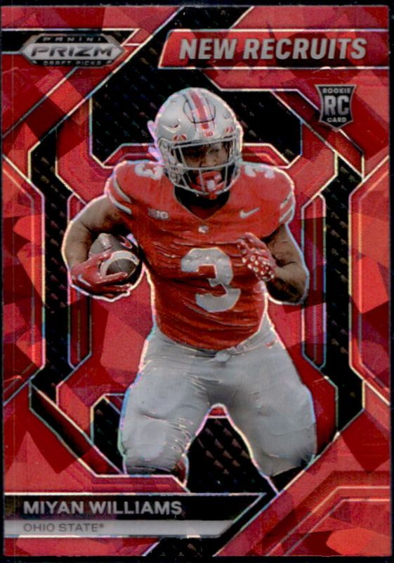 The Miyan Williams 2024 Prizm Draft Picks #NR-MWS New Recruits - Red Ice Rookie card is 1 of 136 Miyan Williams' card variations in the 2024 Prizm Draft Picks set being tracked by Sports Card Investor, including Base, Green, Purple Wave, Red Ice, and Ruby Wave.
