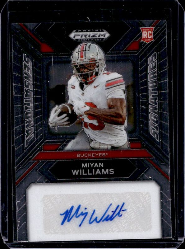 The Miyan Williams 2024 Prizm Draft Picks #SS-MWS Sensational Signatures Rookie card is 1 of 136 Miyan Williams' card variations in the 2024 Prizm Draft Picks set being tracked by Sports Card Investor, including Base, Green, Purple Wave, Red Ice, and Ruby Wave.