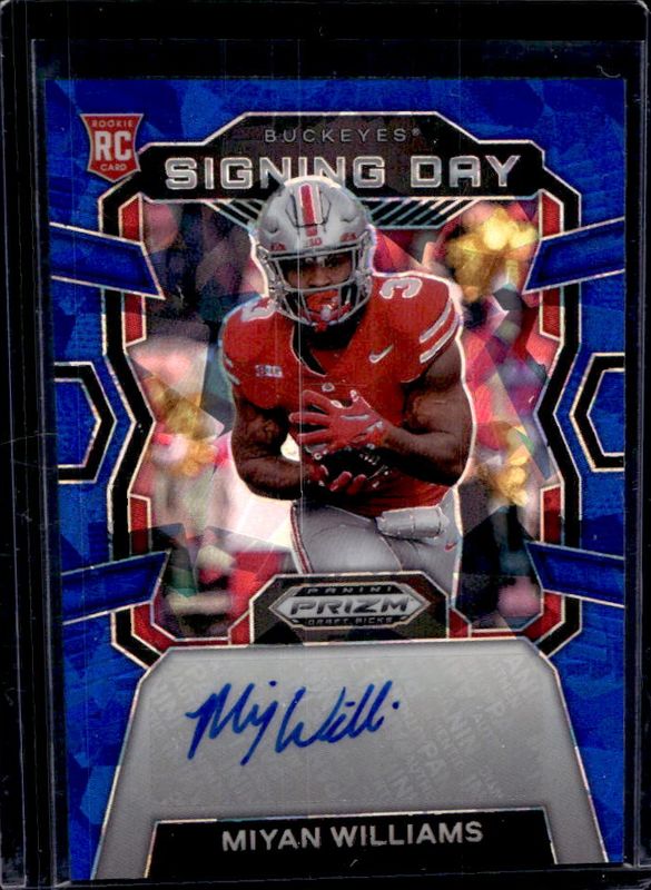 The Miyan Williams 2024 Prizm Draft Picks #SD-MWS Signing Day Autographs - Blue Ice /75 Rookie card is 1 of 136 Miyan Williams' card variations in the 2024 Prizm Draft Picks set being tracked by Sports Card Investor, including Base, Green, Purple Wave, Red Ice, and Ruby Wave.