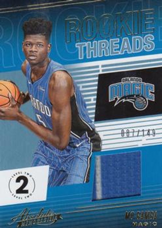 The Mo Bamba 2018 Absolute Memorabilia #RT-MBB Rookie Threads Level 2 /149 card is 1 of 40 Mo Bamba's card variations in the 2018 Absolute Memorabilia set being tracked by Sports Card Investor, including Base, 10th Anniversary /10, Maroon /7, Rookie Threads /199, and Tools of the Trade Three Swatch Signatures /149.