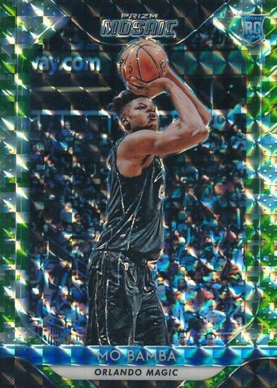 This card is 1 of 9 Mo Bamba's card variations in the 2018 Prizm Mosaic set being tracked by Sports Card Investor, including Base, Blue, Green, Red, and Orange /99.
