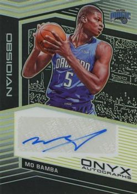 The Mo Bamba 2019 Obsidian #OA-MBB Onyx Autographs - Electric Etch Yellow /10 card is 1 of 21 Mo Bamba's card variations in the 2019 Obsidian set being tracked by Sports Card Investor, including Jersey Autographs /99, Matrix Autographs /99, Onyx Autographs /99, Jersey Autographs - Electric Etch Purple /75, and Matrix Autographs - Electric Etch Purple /75.
