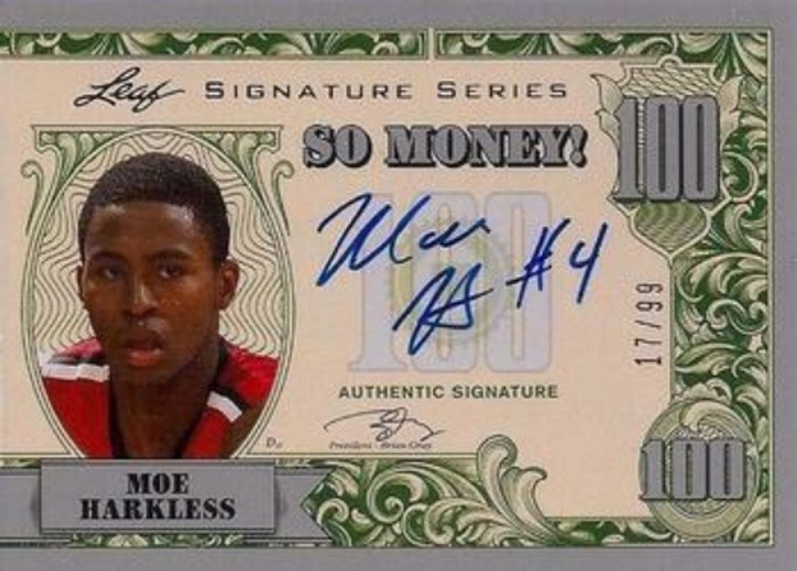 The Moe Harkless 2012 Leaf Signature Series #SM-MH2 So Money! - Silver /99 Rookie card is 1 of 46 Moe Harkless' card variations in the 2012 Leaf Signature Series set being tracked by Sports Card Investor, including Base, Silver /99, Gold /25, Blue /10, and Red /5.