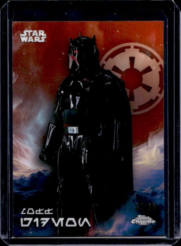The Moff Gideon 2025 Topps Chrome Star Wars #AV-91 Aurebesh Variation - Rebel Orange Orange Refractor /25 card is 1 of 38 Moff Gideon's card variations in the 2025 Topps Chrome Star Wars set being tracked by Sports Card Investor, including Base, Black & White Shimmer Refractor, Blue Pulsar Refractor, Prism Refractor, and Purple Pulsar Refractor.